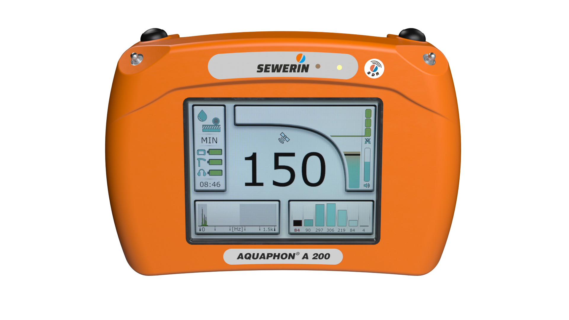 The Aquaphon A200 ground microphone offers a 5.7” colour touch screen - displaying: